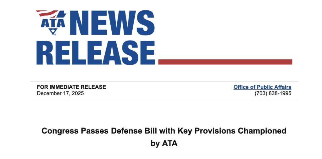 | Washington – Today, the American Trucking Associations applauded the passage of the National Defense Authorization Act that includes language for which ATA strongly advocated to enhance national security, support truck drivers, and add transparency and efficiency to the process of moving military families. The legislation now heads to the president’s desk to be signed into law. “In spite of the increasingly challenging political and legislative environment, ATA continues to grind out wins for the trucking industry,” said Henry Hanscom, ATA’s senior vice president of legislative affairs. “Truck drivers and motor carriers are critical to our national security, delivering military personnel and supplies where they need to be safely, securely, and on time. The significant reforms that ATA successfully secured in the annual defense bill will strengthen this essential partnership between trucking and the Pentagon.” “This bill requires military installations to provide restroom access to truck drivers delivering munitions for DoD and includes several provisions intended to address waste, fraud, and abuse in the transportation of military freight,” said Mike Matousek, director of the ATA Government Freight Conference. “Our members provide a vital service to DoD, and these reforms should improve highway safety, national security, and our partnership with a customer that our carriers are honored to serve. We appreciate Reps. Sam Graves and Derek Schmidt for their leadership on these issues, our GFC members for their continued advocacy efforts, and HASC and SASC for their consideration and support.” “The moving and storage industry is indispensable to military readiness, yet recent actions by DoD have made it increasingly difficult for our members to serve the brave men and women in our armed forces,” said Dan Hilton, executive director of the ATA Moving and Storage Conference. “Our industry takes pride in facilitating hundreds of thousands of seamless moves each year, relocating military families and their possessions wherever and whenever duty calls. We appreciate Congress’ willingness to listen to our concerns and address these issues by enacting measures that will improve the process of military moves and ensure proper oversight is in place.” Enhancing National Security Eliminate Waste, Fraud, and Abuse The bill (1) requires DoD to establish a complaint process for government and industry stakeholders to notify the Department of potential noncompliance with federal laws and agency rules regarding the transportation of military freight, (2) requires DoD to provide training to Transportation Officers and industry service providers that use the Global Freight Management system, (3) gives the Commander of Surface Deployment and Distribution Command authority to override improper or excessive actions against a transportation service provider by a military installation, and (4) requires DoD to audit the Freight Carrier Registration Program to ensure that service providers have active DOT operating authority, and that users of the system can easily identify asset-based carriers and freight brokers. Supporting Truck Drivers Mandate Restroom Access for Munitions Haulers The bill requires DoD to provide restroom access to truck drivers that haul arms, ammunition, and explosives and are required to enter a secure hold or safe haven parking location at a military installation. The restrooms are required to be well lit, address gender specific needs, and be located near the parking areas. It also requires DoD to create a process for drivers and carriers to notify the agency of potential noncompliance. Improving Relocation of Military Families Add Oversight of Certain Defense Personal Property Matters The bill contains a provision establishing the Defense Personal Property Management Office under the Office of the Under Secretary of Defense for Personnel and Readiness. The Secretary of Defense will be tasked with deciding where the DPPMO will be located within the Department of Defense and will be required to brief Congress on his plan. Set Benchmarks for Relocation Contracts The bill adds oversight requirements following the failed Global Household Goods Contract, which DoD cancelled in June 2025. GHC was a sole-source contract for the movement of service members and their families from one duty station to another that was plagued by poor planning and implementation and failed to account for the economics of the moving and storage industry meant to support the contract. The bill requires any future contracts to ensure that moving and storage companies can support military readiness and ensure the safe, reliable transportation of the possessions of military families. Study the Adequacy of Reimbursement Costs The bill requires a report to Congress on the adequacy of reimbursement for expenses incurred by servicemembers undergoing a permanent change of station. This report will provide helpful insights into these costs for military families and the armed services. Study the Permanent Change of Station Process for the Coast Guard The bill will help improve the relocation processes and services available for Coast Guard permanent changes of station by mandating a study of the current process. The report must include an evaluation of the “effectiveness of using contracted movers” for these moves, including the estimated costs associated with lost/damaged personal property; delays in scheduling these moves through a contracted mover; delayed deliveries; and other related challenges, along with recommendations to improve the Coast Guard’s permanent change of station process. |