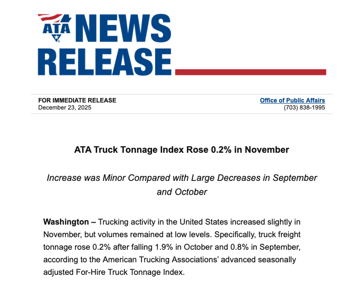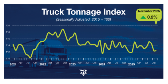In November, the ATA advanced seasonally adjusted For-Hire Truck Tonnage Index equaled 112.4, up from 112.2 in October. The index, which is based on 2015 as 100, contracted 0.3% from the same month last year after decreasing 1.5% in October. Year-to-date, compared with the same period in 2024, tonnage was unchanged.